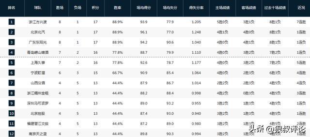 CBA最新排名:广厦7连胜重返榜首 山西主场爆冷4连败 四川0胜9负